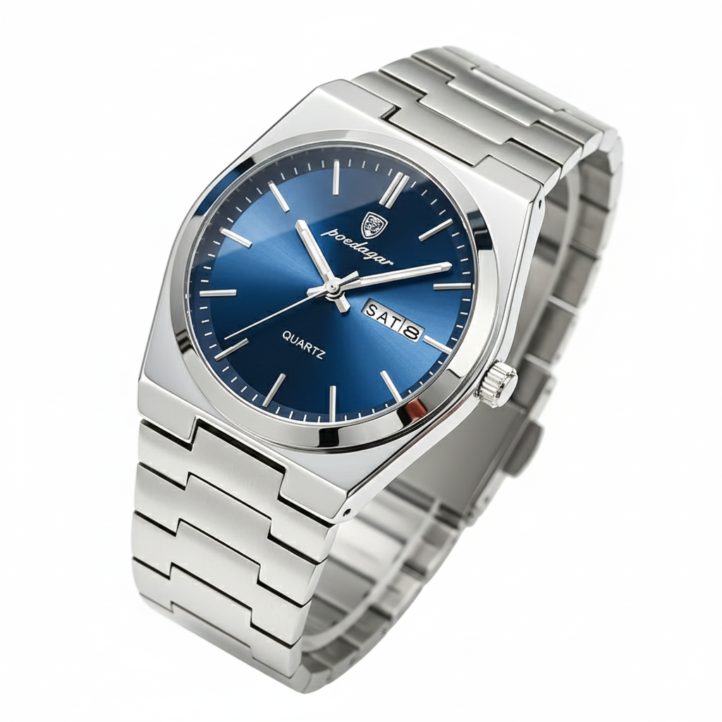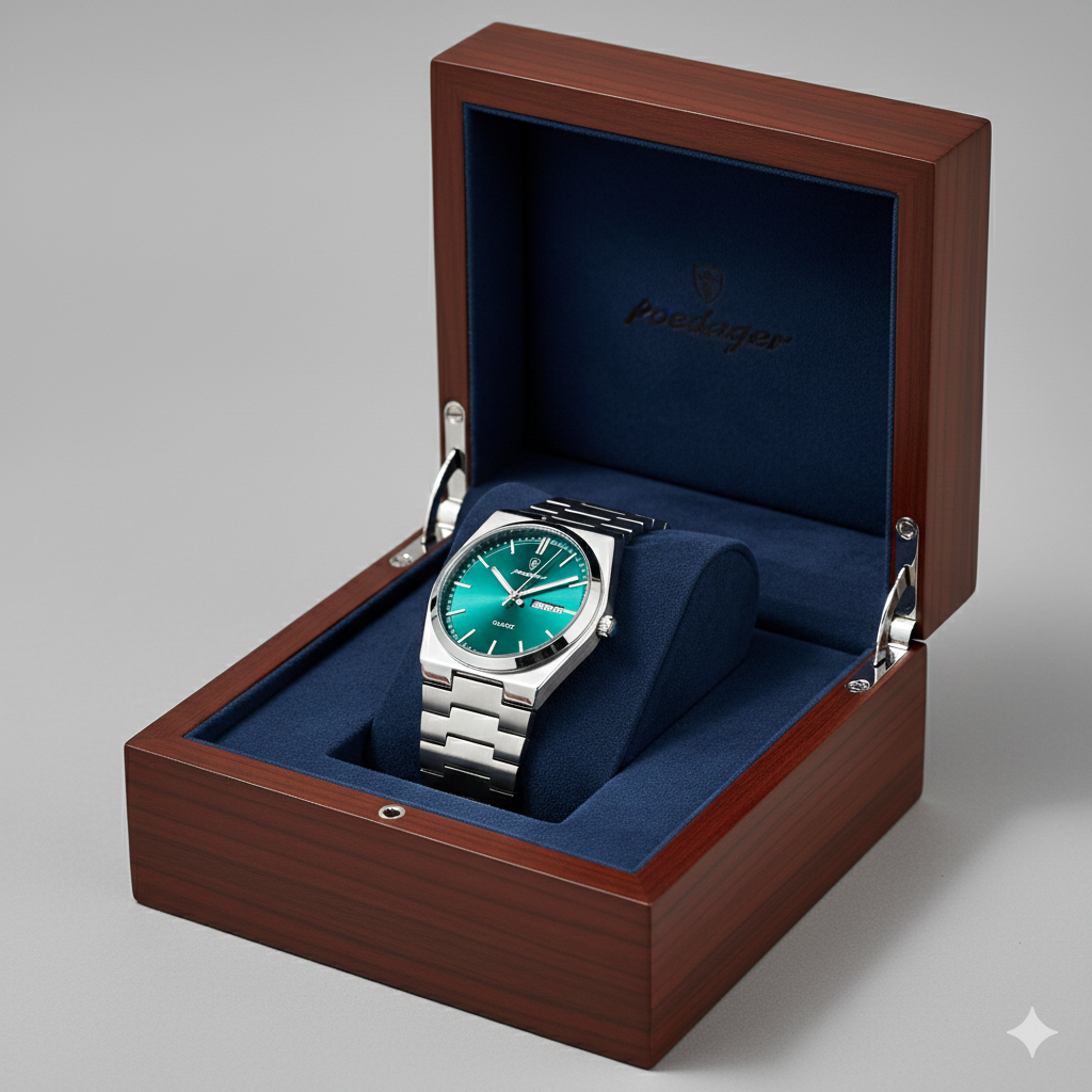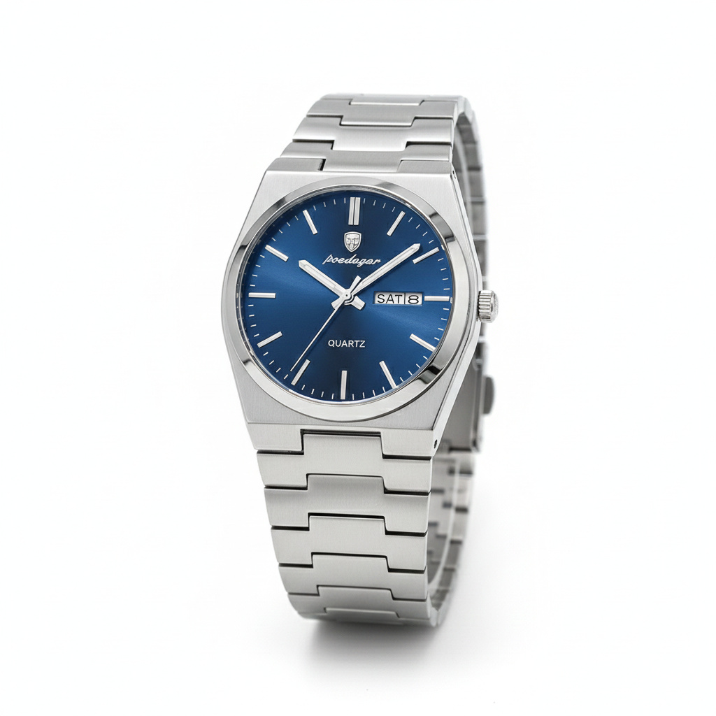 O Relógio Poedagar Skyline é feito de aço inoxidável de alta qualidade. Ele é resistente à água e conta com um ajustador para se adaptar a qualquer pulso e é enviada uma caixa de cartão com o relógio.